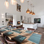 table and chairs, light fixture, curtains, and sliding doors