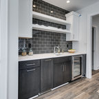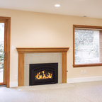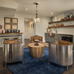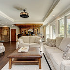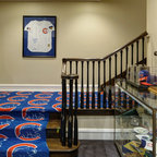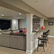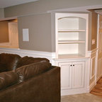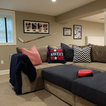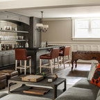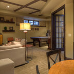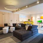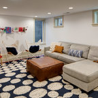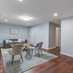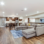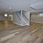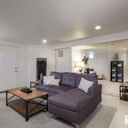 Diseño de sótano en el subsuelo tradicional renovado, grande, sin chimenea, con paredes beige, suelo laminado y suelo gris — Houzz