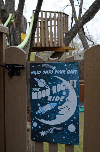 A few years after the initial construction, Curvan added a zip line from the tree house to the side yard. The weight limit on the line is 100 pounds. He also created a soft, safe landing pad against the back fence. A vintage Moon Rocket–ride sign is nailed to the gate that opens to the zip line