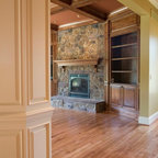 Imagen de salón para visitas clásico con paredes beige, suelo de madera en tonos medios, chimenea tradicional, marco de chimenea de piedra, televisor retractable y suelo azul — Houzz