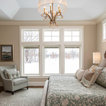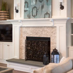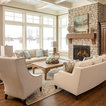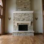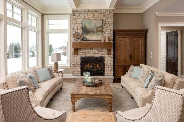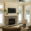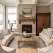 Living room fireplace with stone with warm wood mantel. Soothing cream colors.