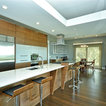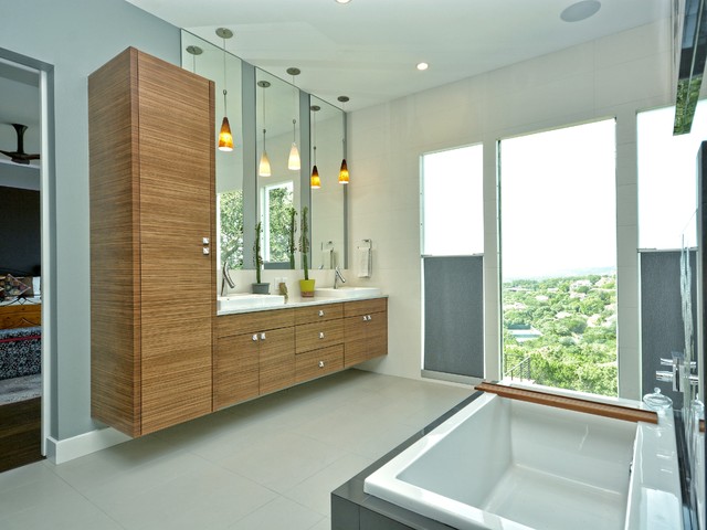 Imagen de cuarto de baño principal, actual, grande, con lavabo encastrado, armarios con paneles lisos, puertas de armario de madera oscura, bañera encastrada, baldosas y/o azulejos blancos, paredes grises, baldosas y/o azulejos de porcelana, suelo de baldosas de porcelana, encimera de cuarzo compacto y suelo beige — Houzz