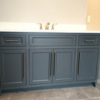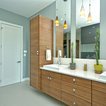 Kids bathroom. Tall cabinet with 60” vanity. Single bowl sink, cabinet underneath, drawers on either side. Cabinet would be on right side, across from the toilet.