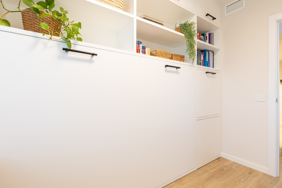 En la habitación polivalente, que combina despacho y dormitorio de invitados, el reto fue aprovechar cada centímetro. En solo siete metros cuadrados logramos integrar dos zonas de trabajo y una cama abatible de 135 cm, que se oculta dentro del mueble cuando no se utiliza, manteniendo la estancia despejada y versátil.