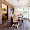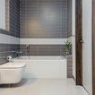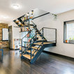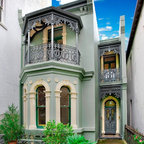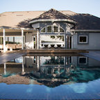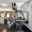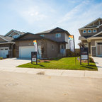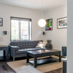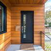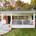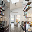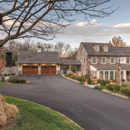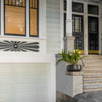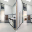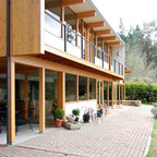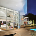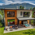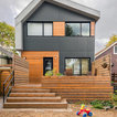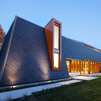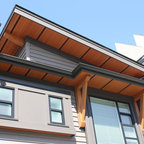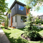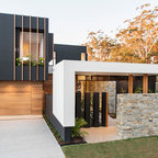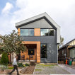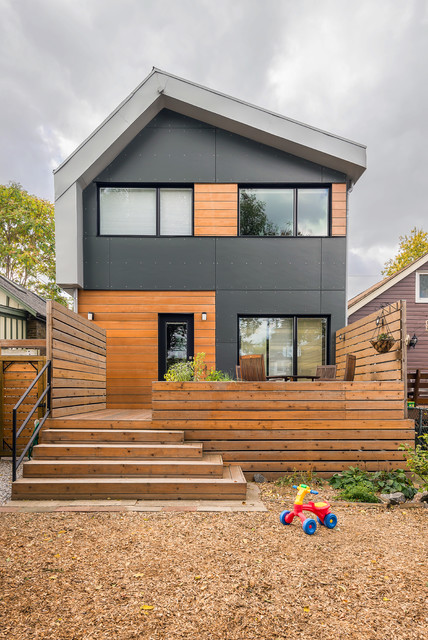 Ejemplo de fachada gris, contemporánea, de dos plantas, con revestimientos combinados y tejado a dos aguas — Houzz
