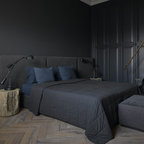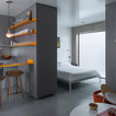 Ejemplo de dormitorio principal, actual, pequeño, sin chimenea, con paredes grises, suelo de cemento y suelo gris — Houzz