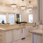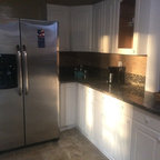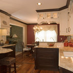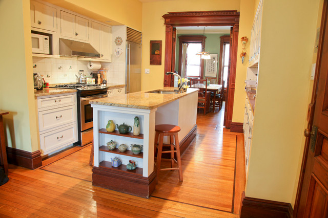 Imagen de cocina comedor tradicional, de tamaño medio, con fregadero bajoencimera, armarios estilo shaker, puertas de armario blancas, encimera de granito, salpicadero blanco, salpicadero de azulejos de cerámica, electrodomésticos de acero inoxidable, suelo de madera en tonos medios y una isla — Houzz