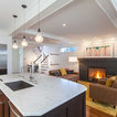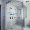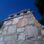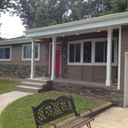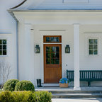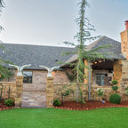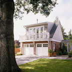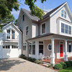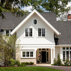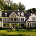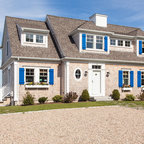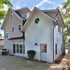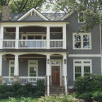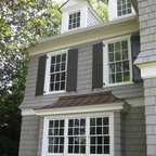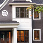 Foto de fachada de casa gris, clásica, grande, de dos plantas, con tejado a dos aguas, tejado de teja de madera y revestimientos combinados — Houzz