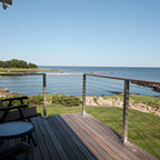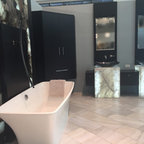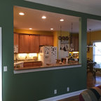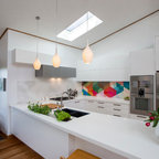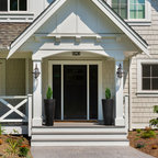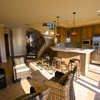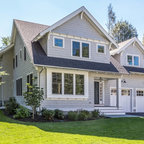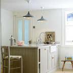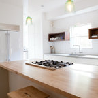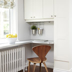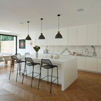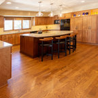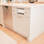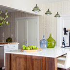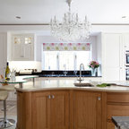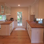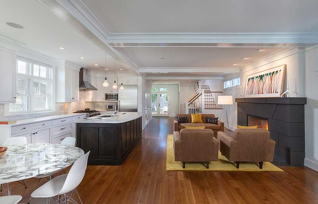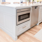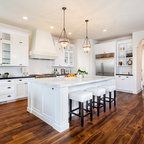 Modelo de cocina en L, clásica, grande, abierta, con puertas de armario blancas, encimera de mármol, salpicadero blanco, electrodomésticos de acero inoxidable, suelo de madera en tonos medios, una isla, fregadero bajoencimera, armarios estilo shaker, salpicadero de azulejos de piedra y suelo marrón — Houzz