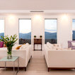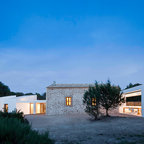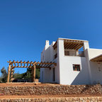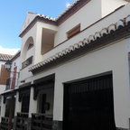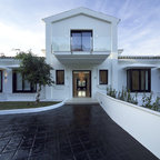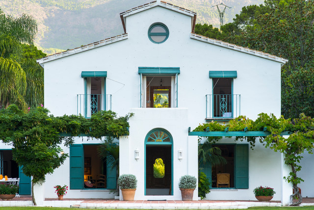 Modelo de fachada blanca, mediterránea, grande, de dos plantas, con revestimiento de estuco y tejado a dos aguas — Houzz