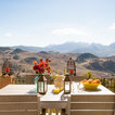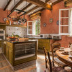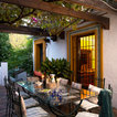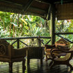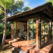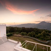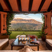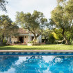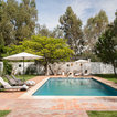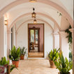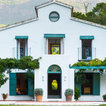 Spanish styling, lots of windows, bell tower, turquoise on white, all the greenery, and the small balconies!