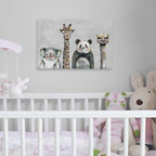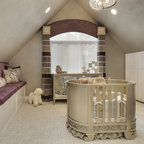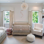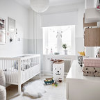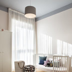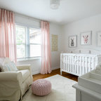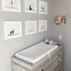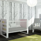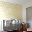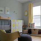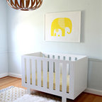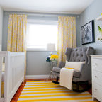 Ejemplo de habitación de bebé neutra actual, pequeña, con paredes amarillas y suelo de madera en tonos medios — Houzz