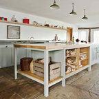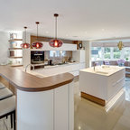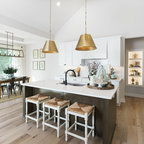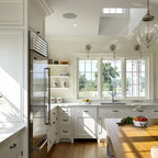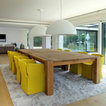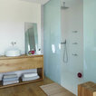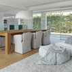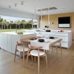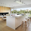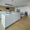 En una cocina muy espaciosa. Aquí hay dos islas dispuestas en paralelo. En la primera, está la zona de cocción con un extractor de techo, además de una barra para desayunos y comidas informales. Junto al punto de agua y la zona de preparación, hay un anexo a un nivel más bajo con mesa y sillas para largas comidas. Esta distribución permite aprovechar el espacio, al mismo tiempo que se disfruta de la pared acristalada con vistas al campo. En detalle: en contraste con los muebles blancos, el suelo de parqué natural para aportar calidez.