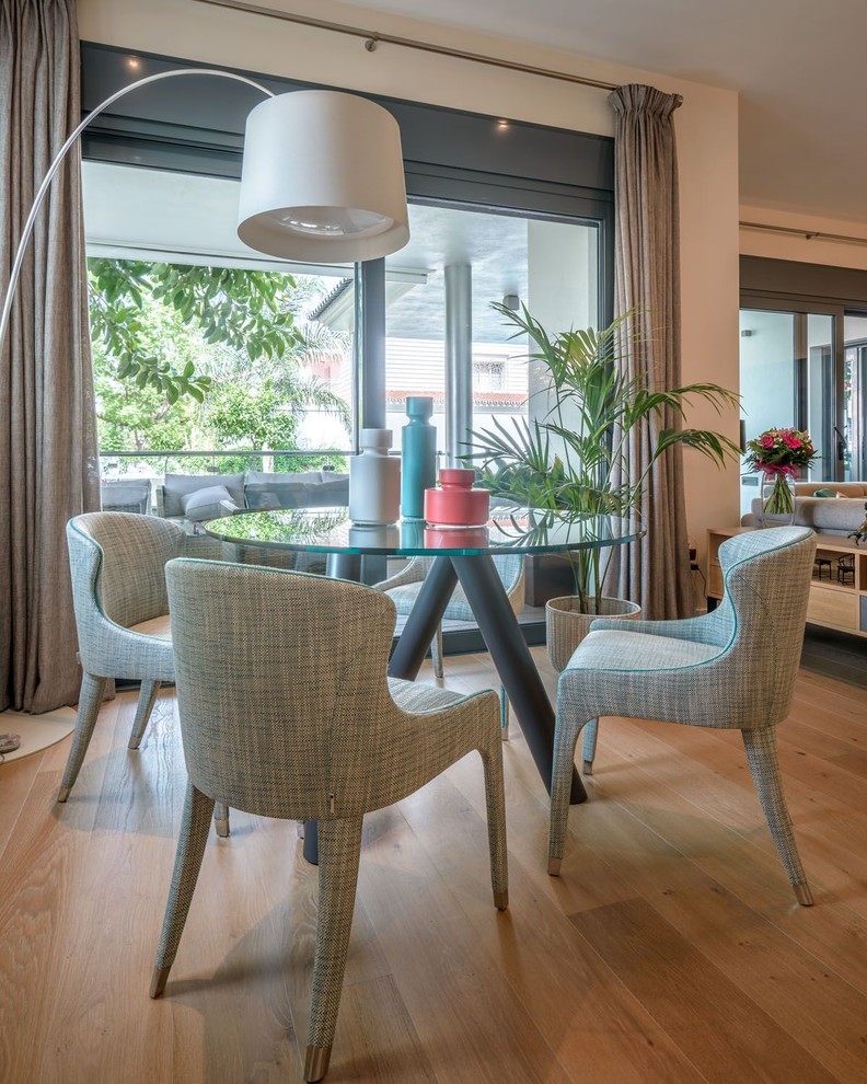 Detalle de la zona del comedor informal de verano, que está junto a la terraza. Destaca la lámpara Twiggy de Foscarini, regulable tanto en intensidd como en tamaño esta zona. Las butacas se han tapizado con una chenilla color turquesa estampada, y llevan cordoncillo en turquesa a juego. La mesa es un diseño itaiano con patas en acero barnizado color grafito y cristal transparente de 15 mm.