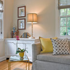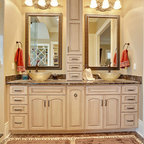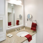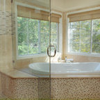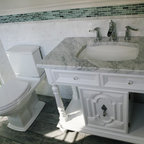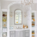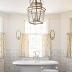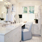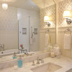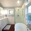 Imagen de cuarto de baño tradicional con lavabo bajoencimera, puertas de armario blancas, bañera exenta, ducha empotrada, baldosas y/o azulejos blancos y baldosas y/o azulejos de cemento — Houzz