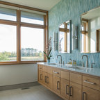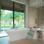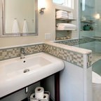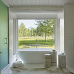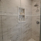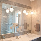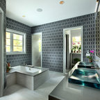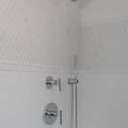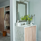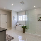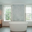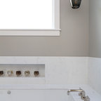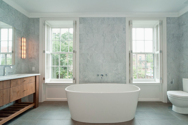 Foto de cuarto de baño principal, clásico renovado, con bañera exenta, baldosas y/o azulejos blancos, baldosas y/o azulejos de piedra, armarios tipo mueble, puertas de armario de madera oscura, sanitario de una pieza, paredes grises, suelo de baldosas de porcelana, lavabo bajoencimera, encimera de cuarcita y suelo gris — Houzz