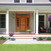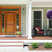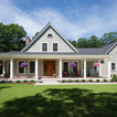 Neutral field, white trim. Contrast comes from roof, front door, hanging baskets.