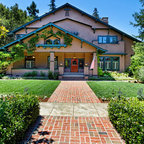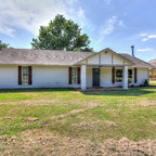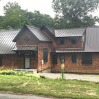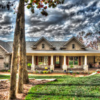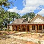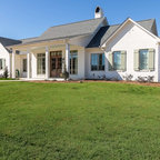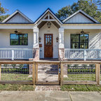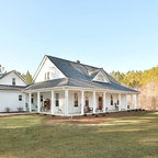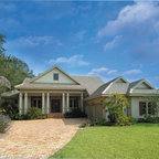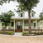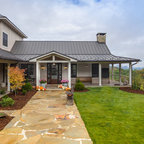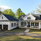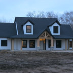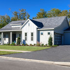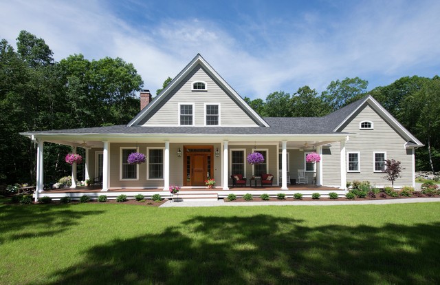 Diseño de fachada de casa beige, de estilo de casa de campo, de tamaño medio, de una planta, con revestimiento de aglomerado de cemento, tejado a dos aguas y tejado de teja de madera — Houzz
