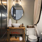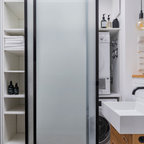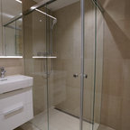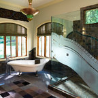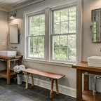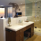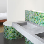 Imagen de cuarto de baño principal y boiserie, moderno, grande, boiserie, con armarios con paneles lisos, puertas de armario de madera en tonos medios, bañera encastrada, ducha a ras de suelo, sanitario de pared, baldosas y/o azulejos grises, baldosas y/o azulejos de piedra, paredes grises, suelo de azulejos de cemento, lavabo integrado, encimera de vidrio, suelo beige, ducha abierta, encimeras verdes y boiserie — Houzz