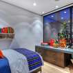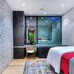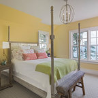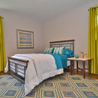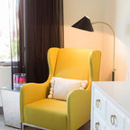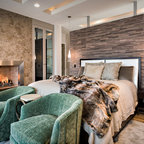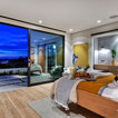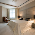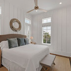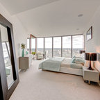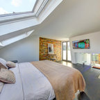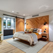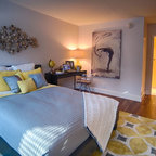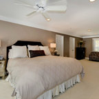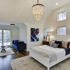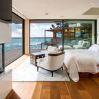 Imagen de dormitorio principal, actual, con paredes blancas, suelo de madera en tonos medios y suelo marrón — Houzz