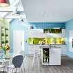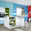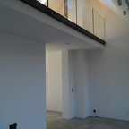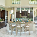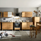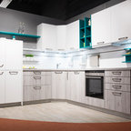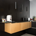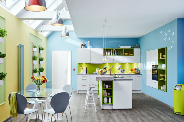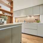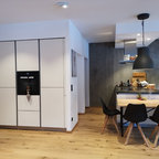 Ejemplo de cocina comedor contemporánea, grande, con armarios con paneles lisos, puertas de armario blancas, salpicadero gris, una isla, suelo de madera en tonos medios y electrodomésticos negros — Houzz