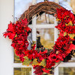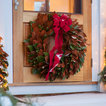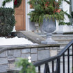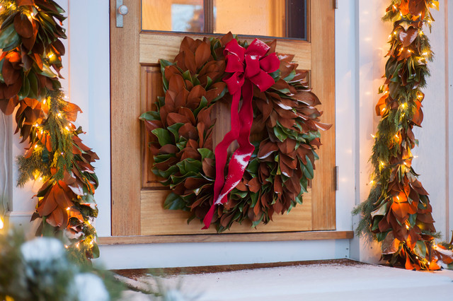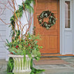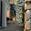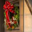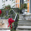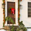 Seasonal decor for exterior home and doorway including lighting, wreath design/haning and garland roping