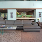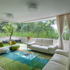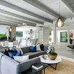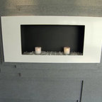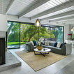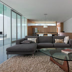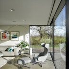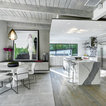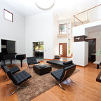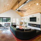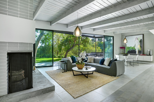 Modelo de salón abierto, moderno, grande, con paredes blancas, chimenea de esquina, marco de chimenea de ladrillo, suelo gris y suelo de cemento — Houzz