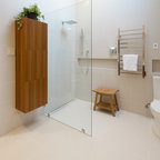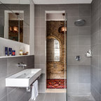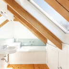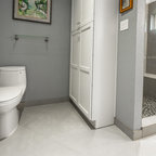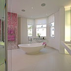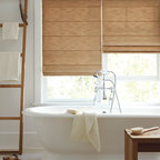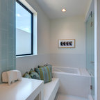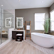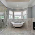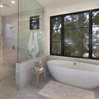 Ejemplo de cuarto de baño principal, contemporáneo, con bañera exenta, suelo de baldosas tipo guijarro y suelo beige — Houzz