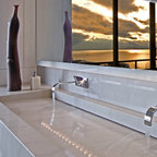 Inspired by the Japanese "roten-buro" (outdoor bath), this master bath uses natural materials and textures to create the feeling of bathing out in nature. Designer: Fumiko Faiman. Photographer: Jeri Koegel.