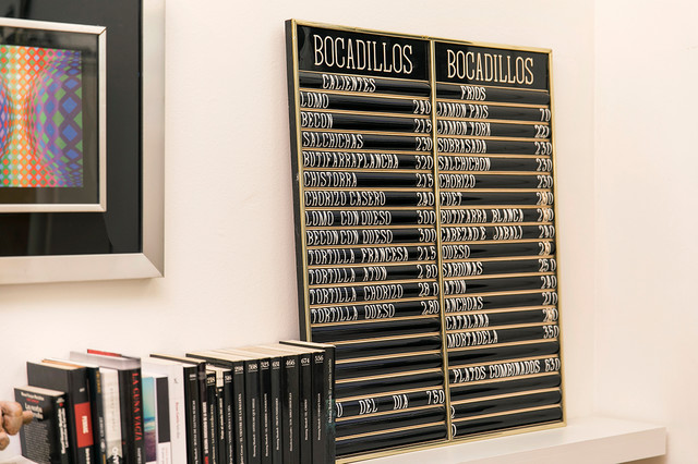 Presidiendo la entrada a la cocina vemos un singular cartel típico de bar… ¿un bocadillo de lomo 240 euros?: “Lo tiraron el primer día que pasamos de la peseta al euro”, cuenta Sonia, entre risas. El marco dorado termina de redondear el rincón al gusto de la dueña: le encanta la combinación de negro y oro para decorar.
