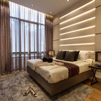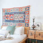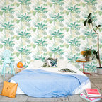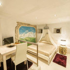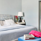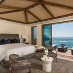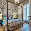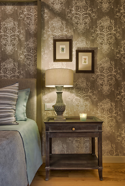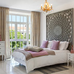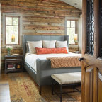 Modelo de dormitorio bohemio con paredes grises y suelo de madera clara — Houzz