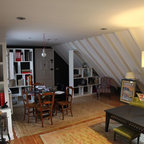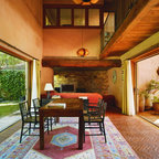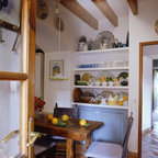 Modelo de comedor de estilo de casa de campo, de tamaño medio, abierto, con paredes blancas y chimenea tradicional — Houzz