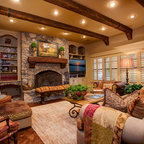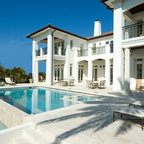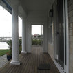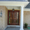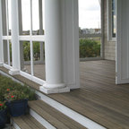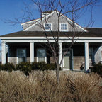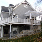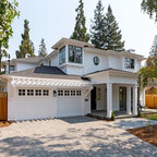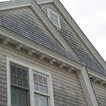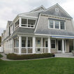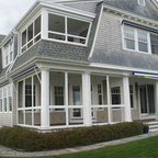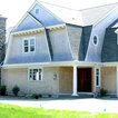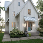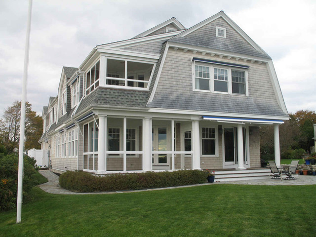 Imagen de fachada de casa beige, costera, grande, de dos plantas, con revestimiento de madera, tejado a dos aguas y tejado de teja de madera — Houzz