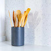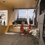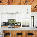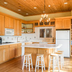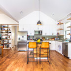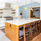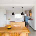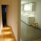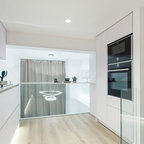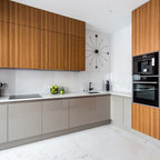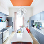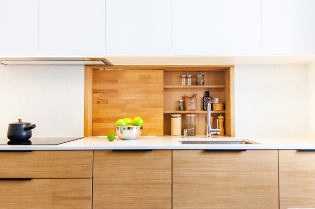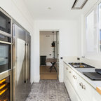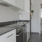 Ejemplo de cocina comedor de galera, contemporánea, de tamaño medio, sin isla, con fregadero bajoencimera, armarios con paneles lisos, puertas de armario de madera clara, salpicadero verde, suelo de baldosas de porcelana, suelo gris y encimeras blancas — Houzz