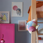 Opta por el blanco y negro… En esta habitación, el blanco y negro se convierte en el foco de atención: la pared y la ropa de cama de rayas, un puff de piel y los caracteres alfanuméricos colgados en la pared. El resultado es una habitación original y creativa, nada austera. Por supuesto, un toque de color siempre es bienvenido: puedes romper la paleta monocromática con unas cortinas o unos banderines de colores vivos, como el diseñador hizo en este caso.
