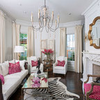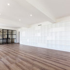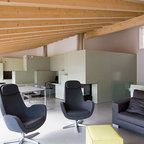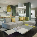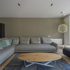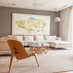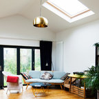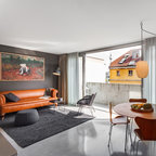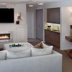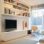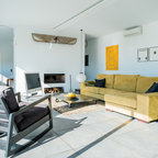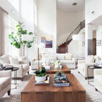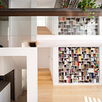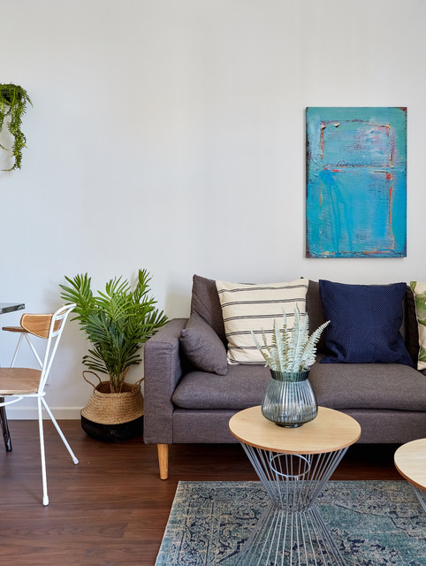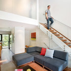 Diseño de salón abierto, contemporáneo, de tamaño medio, con paredes blancas y suelo de madera oscura — Houzz