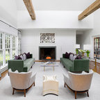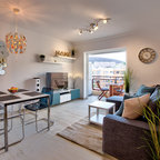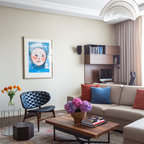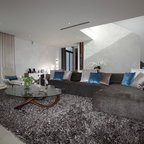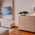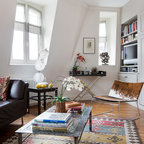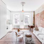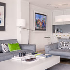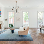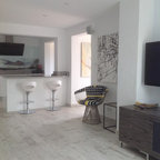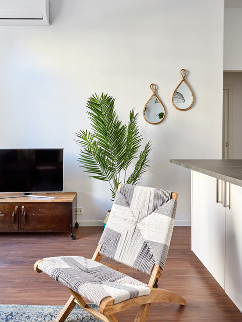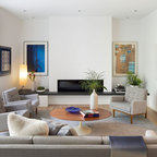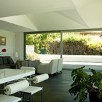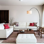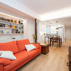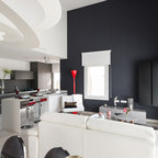 Ejemplo de salón abierto, actual, de tamaño medio, con paredes blancas y suelo de madera oscura — Houzz
