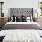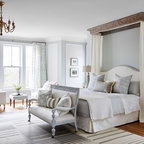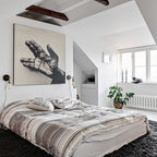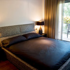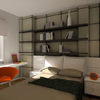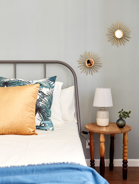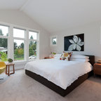Diseño de dormitorio principal, contemporáneo, pequeño, con paredes grises y suelo de madera oscura — Houzz