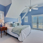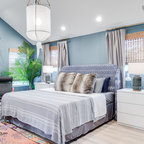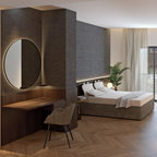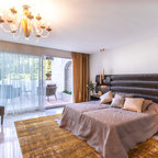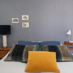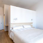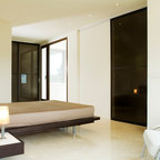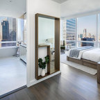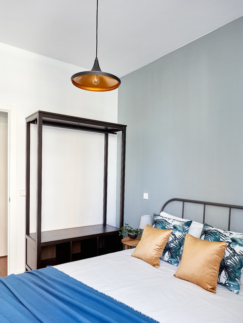 Ejemplo de dormitorio principal, contemporáneo, pequeño, con paredes grises y suelo de madera oscura — Houzz