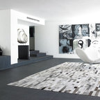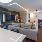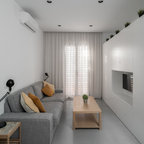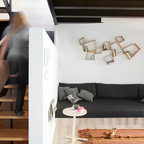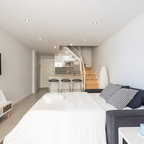 Foto de salón abierto, actual, de tamaño medio, con paredes blancas y suelo de madera oscura — Houzz