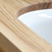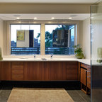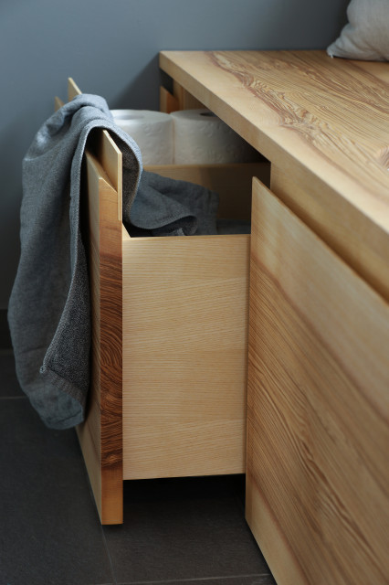 Diseño de cuarto de baño principal, minimalista, de tamaño medio, con armarios con paneles lisos, puertas de armario de madera clara, bañera encastrada sin remate, ducha a ras de suelo, sanitario de una pieza, baldosas y/o azulejos grises, paredes blancas, lavabo sobreencimera, encimera de acrílico, suelo gris y ducha con cortina — Houzz