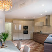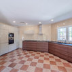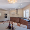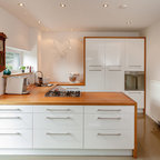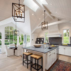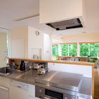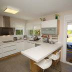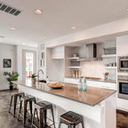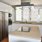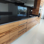 Modelo de cocina comedor contemporánea, grande, con puertas de armario de madera oscura y encimeras negras — Houzz