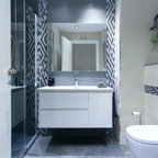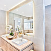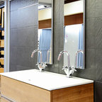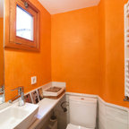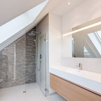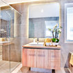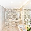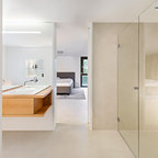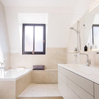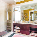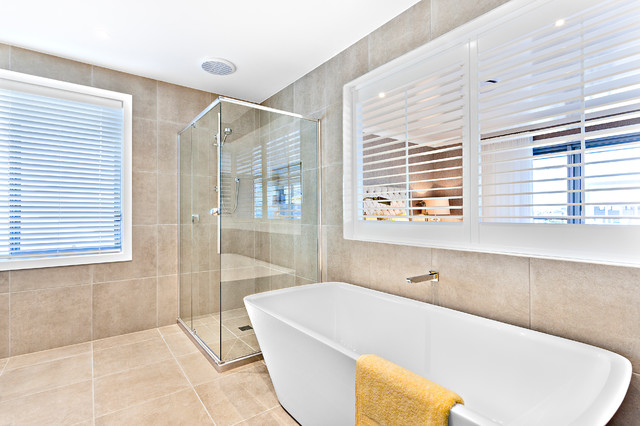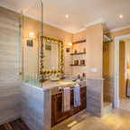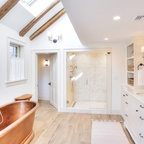 Imagen de cuarto de baño principal, tradicional renovado, grande, con armarios con paneles lisos, puertas de armario marrones, bañera exenta, ducha a ras de suelo, sanitario de pared, baldosas y/o azulejos beige, baldosas y/o azulejos de cerámica, paredes beige, suelo de baldosas de porcelana, lavabo sobreencimera, encimera de madera, suelo beige, ducha con puerta con bisagras y encimeras marrones — Houzz