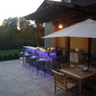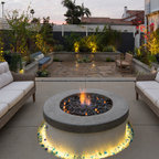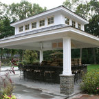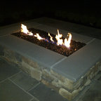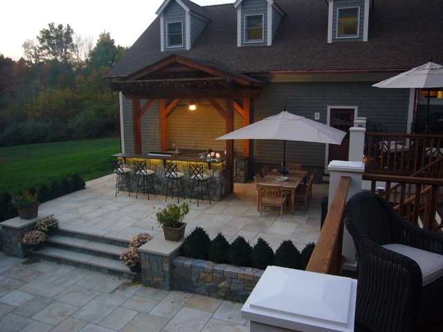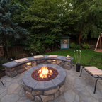 Imagen de patio clásico renovado, grande, en patio trasero, con brasero y adoquines de piedra natural — Houzz