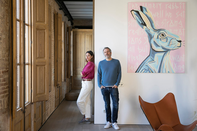 “Nos encanta el barrio porque es como un pueblo donde todo está cerca: el puerto, el parque de la Ciutadella, la playa, el mercado, un sinfín de ofertas culturales y de ocio. Además, el piso transmite paz y tranquilidad”, explica Inda, a quien vemos en la imagen junto a Philippe. Cuadro del artista A4ps