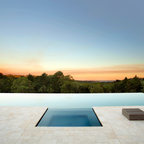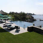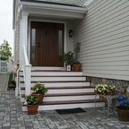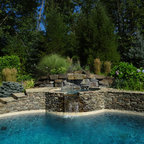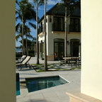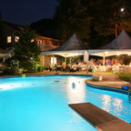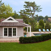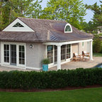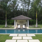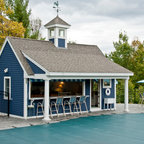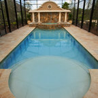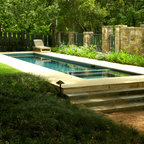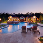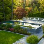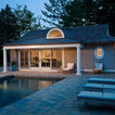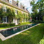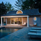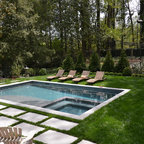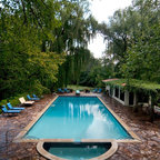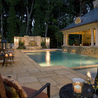 Imagen de casa de la piscina y piscina alargada, tradicional, grande, rectangular, en patio trasero, con adoquines de hormigón — Houzz