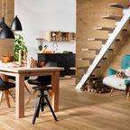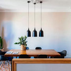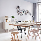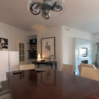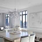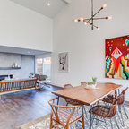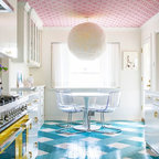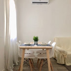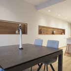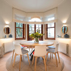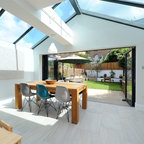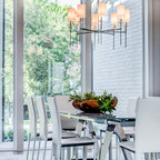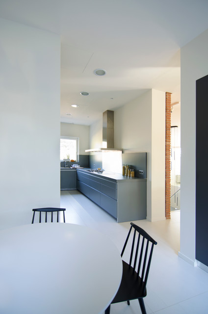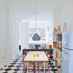 Modelo de comedor de cocina contemporáneo, de tamaño medio, sin chimenea, con paredes blancas y suelo de baldosas de cerámica — Houzz