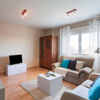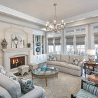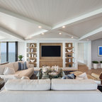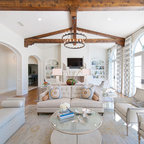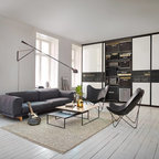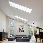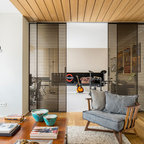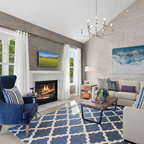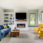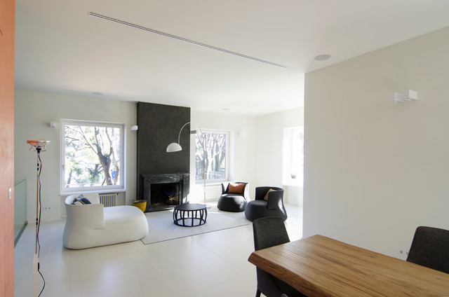 Imagen de sala de estar abierta, contemporánea, de tamaño medio, sin televisor, con paredes blancas y chimenea tradicional — Houzz