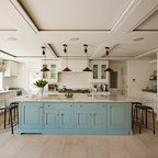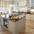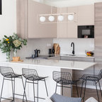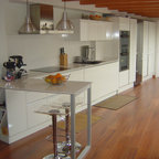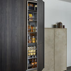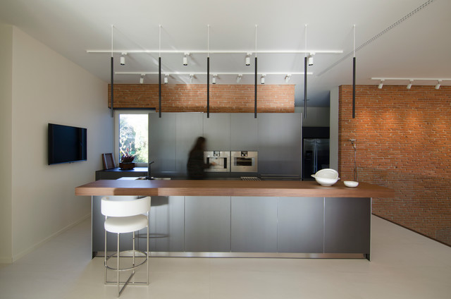 Modelo de cocina lineal, actual, grande, abierta, con armarios con paneles lisos, puertas de armario grises, electrodomésticos de acero inoxidable y una isla — Houzz