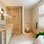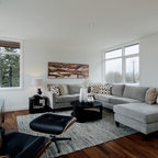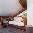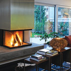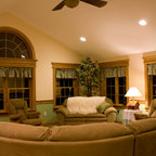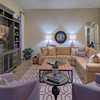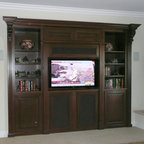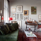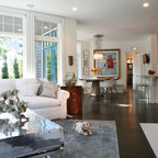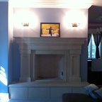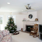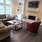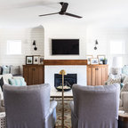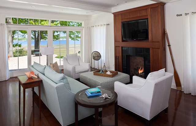 Ejemplo de sala de estar cerrada, tradicional, de tamaño medio, con paredes blancas, suelo de madera oscura, chimenea tradicional, marco de chimenea de baldosas y/o azulejos y televisor colgado en la pared — Houzz